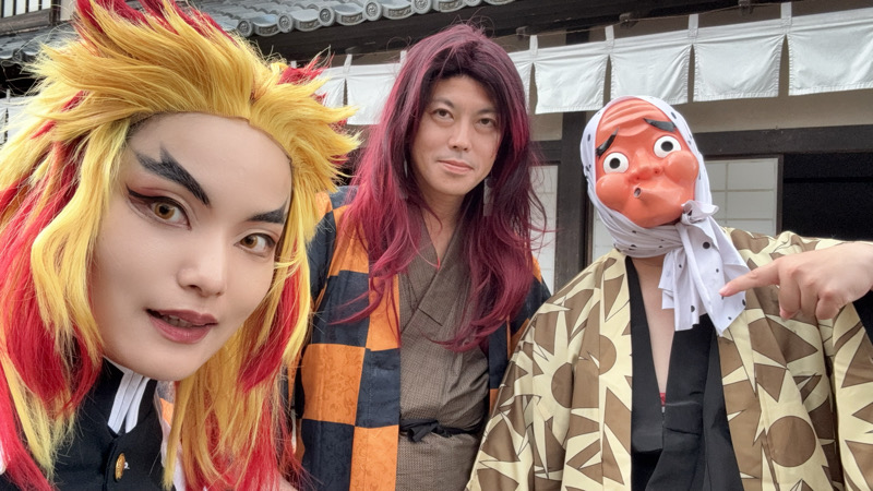 鬼滅だけど全く関わりがない煉獄さんでしたが、快く一緒に写真撮ってくれました!雰囲気がものすごく炭十郎さんと鋼鐵塚さんだ…!