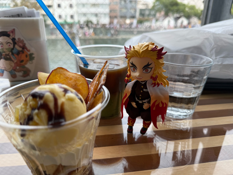 ufotableのカフェに入れたので(早朝に並んで整理券を手に入れました)グルメハントのパフェも。鳴門金時パフェ美味しい