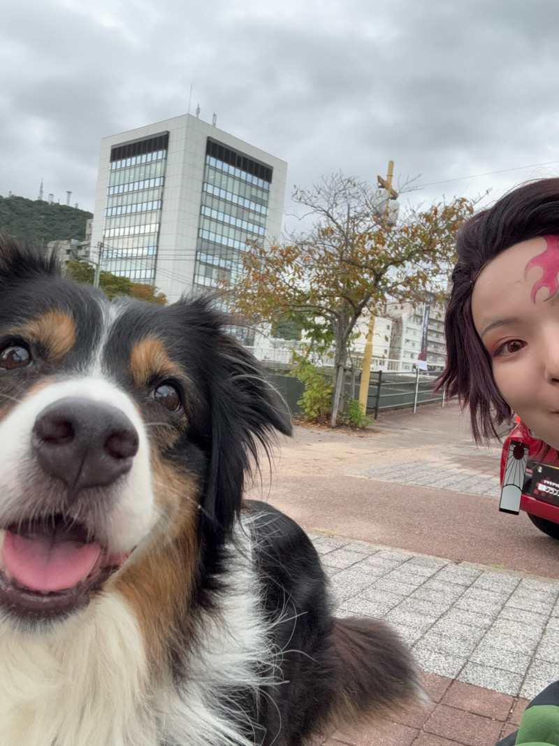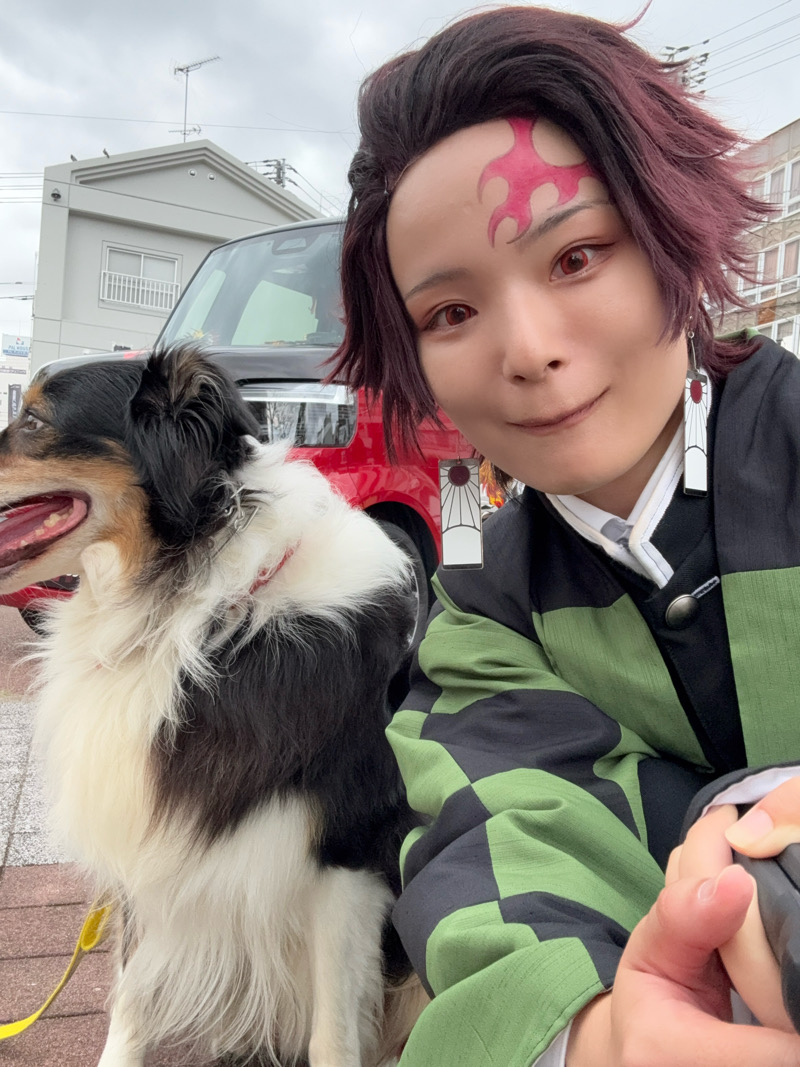 煉獄号と一緒に撮影していた時に、ものすごく可愛いワンちゃんが隣に座ってくれて、飼い主の方が「一緒に撮ってもらおう」とお写真を撮ってくださりました…幸せ…ずっと触っていたい