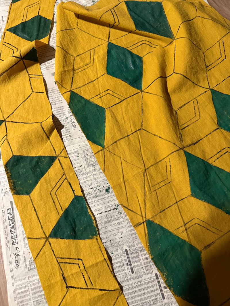 その後ゴムハンコを掘って布に転写を試みるも汚くなってしまい、結局手書きで進めることになってしまいました…柄をミスしないかひたすら不安だった…