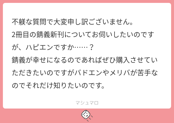 2冊目のご感想もいただけるとのことですっごく楽しみにしているんですが、たくさんの素敵な錆義本をお持ちだと思いますので、お時間ある時にいただけたらすごく嬉しいです✨それまでは今までいただいたマシュマロを何度も読み返しますね!